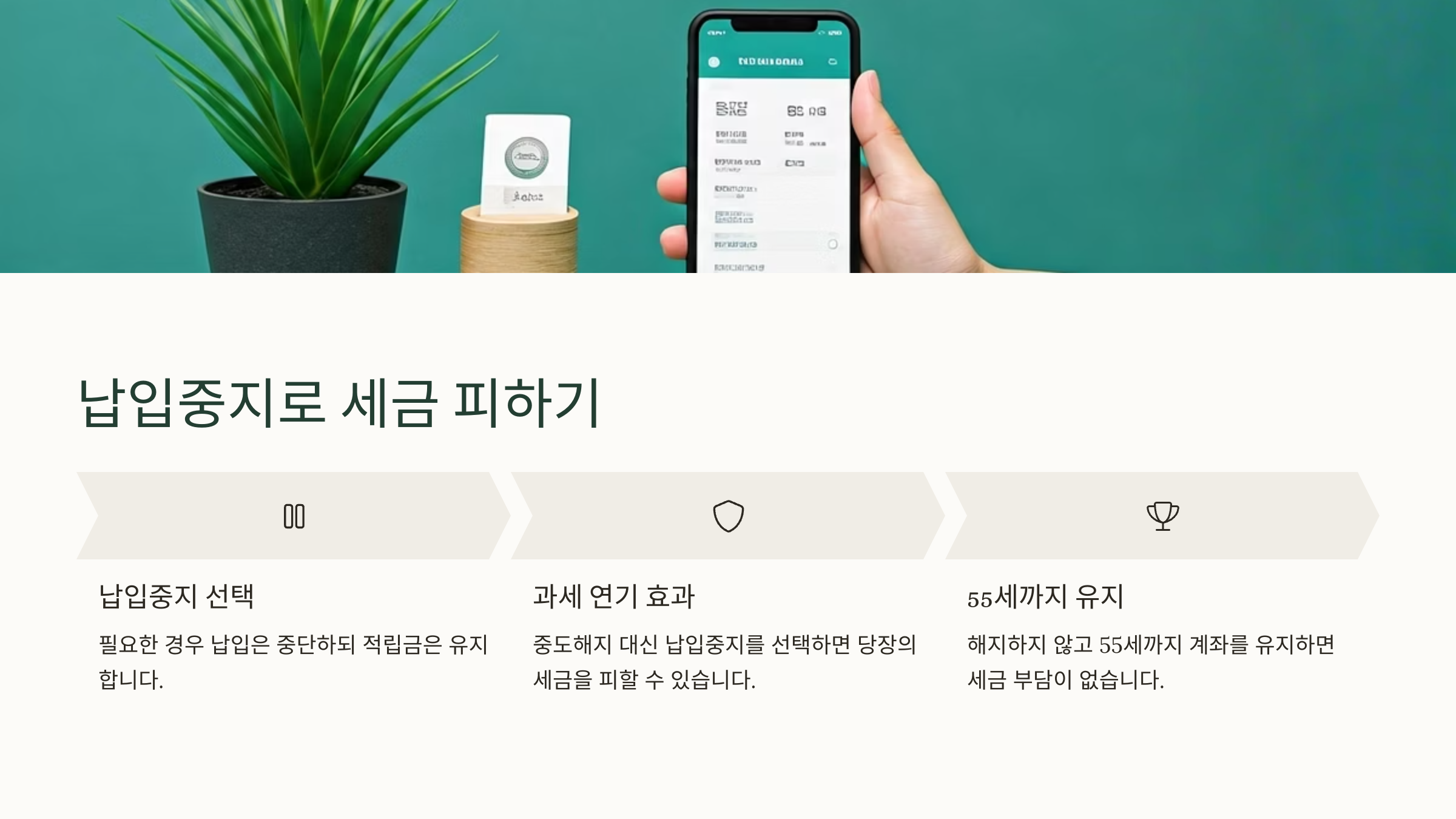 일정 기간 납입만 중단하고 자격은 유지하면, 해지로 인한 세금 손해 없이 나중에 다시 납입도 가능해요.