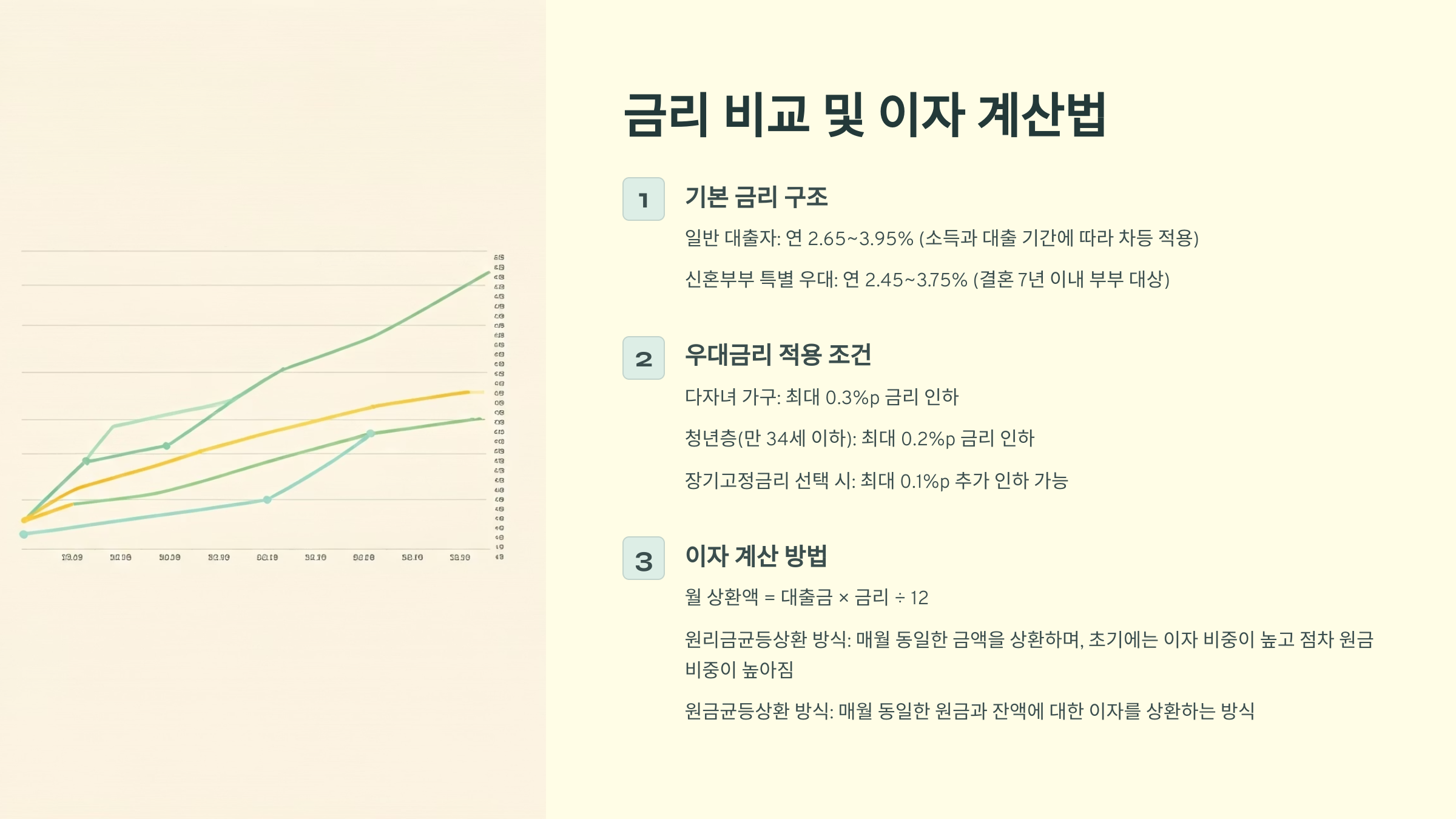 기본 금리에 더해 우대금리(청약저축, 다자녀, 신혼부부 등)까지 적용하면 실제 금리는 더 낮아지기도 해요. 대출 금액이 커질수록 이자 차이는 커지므로 꼭 비교해봐야 해요.