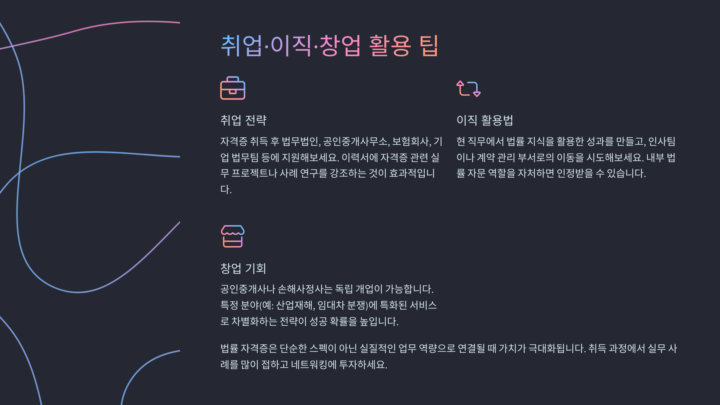 법률 자격증은 단순한 자격 취득이 아니라, 현실적인 커리어 도구가 될 수 있어요.