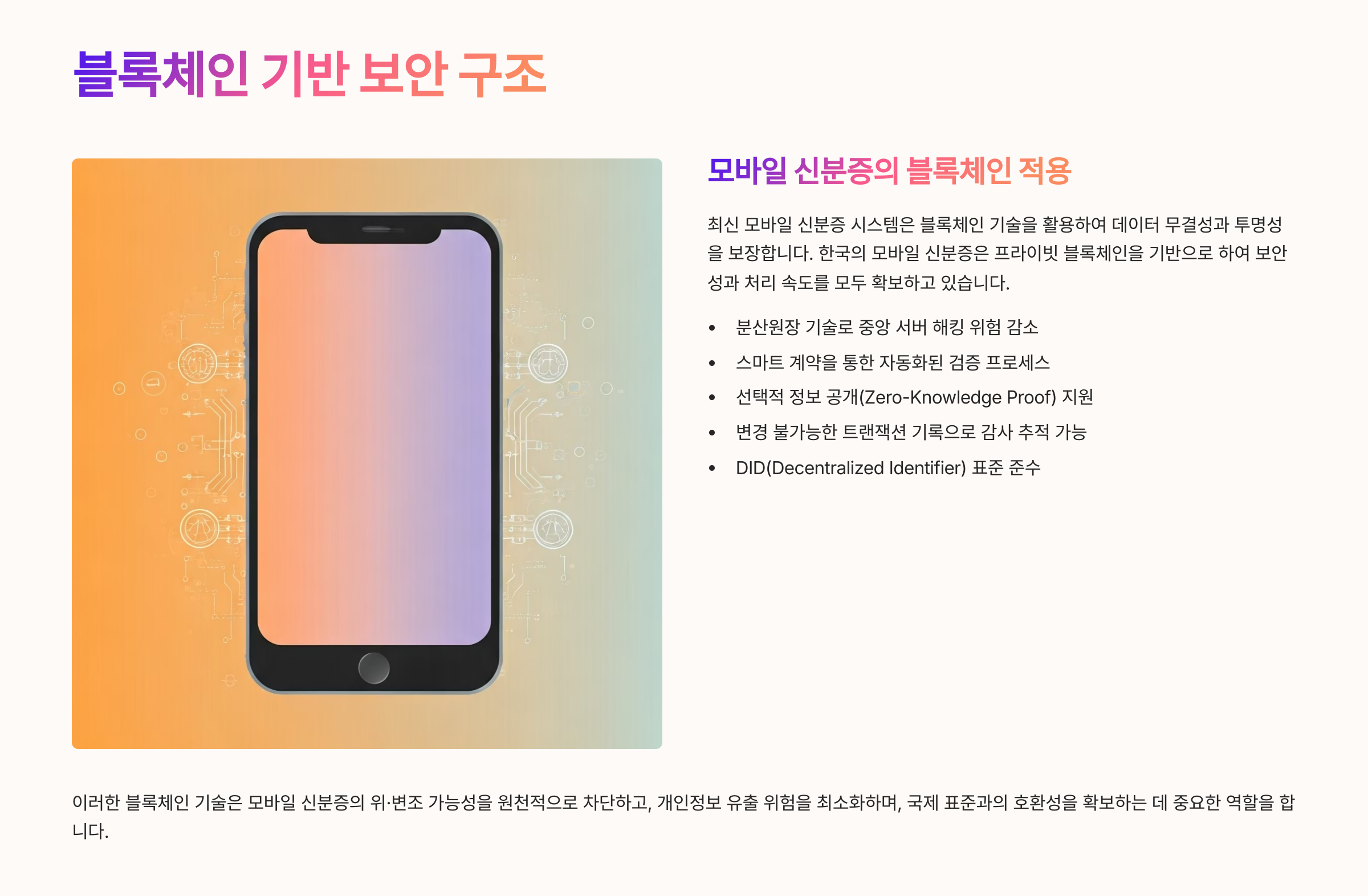 정보를 중앙 서버가 아닌 분산 저장 방식으로 처리해서 해킹이나 위변조를 방지하는 구조예요.