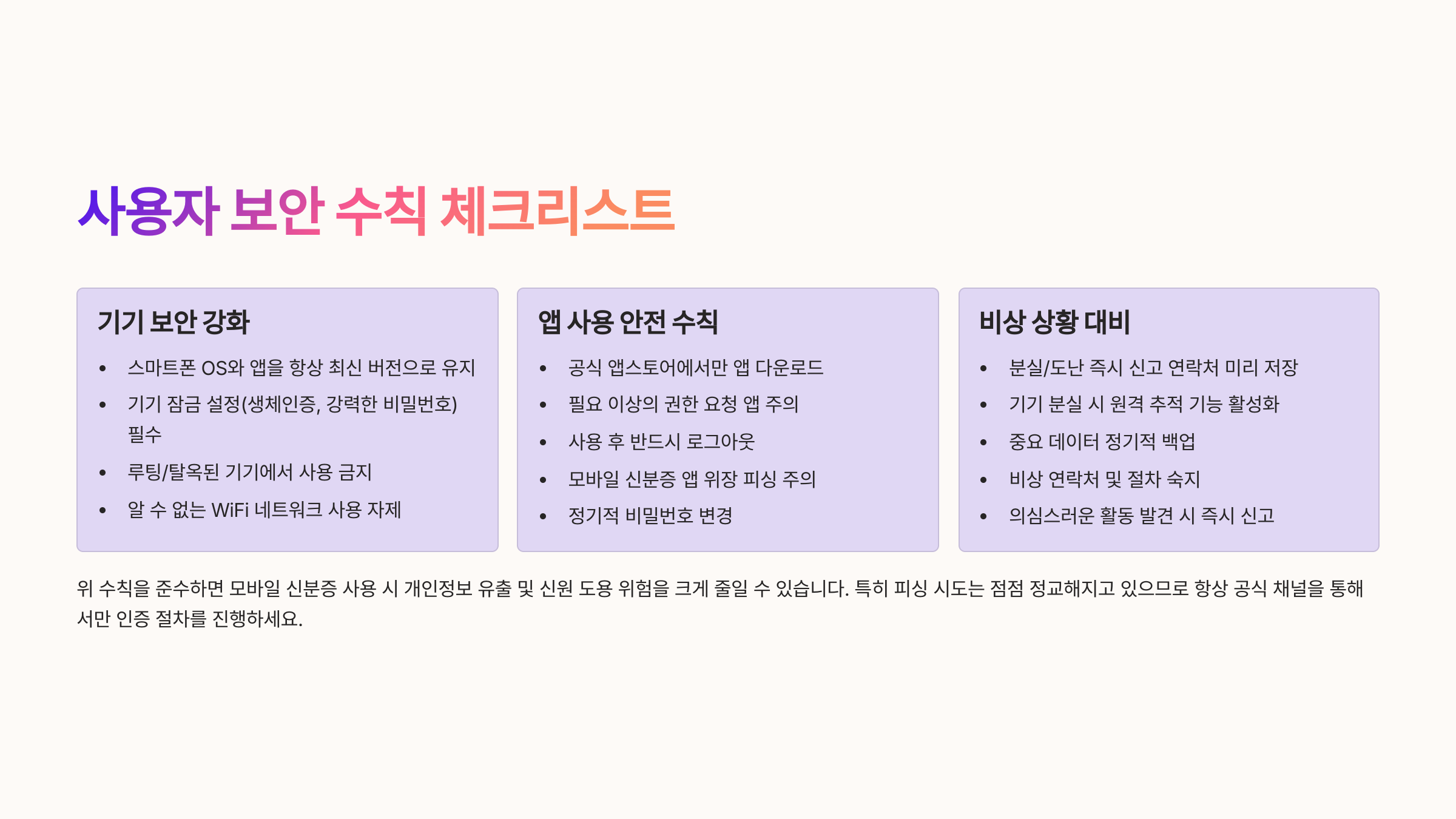 아무리 보안이 뛰어난 모바일신분증이라도, 사용자가 기본 수칙을 지키지 않으면 위험에 노출될 수 있어요.