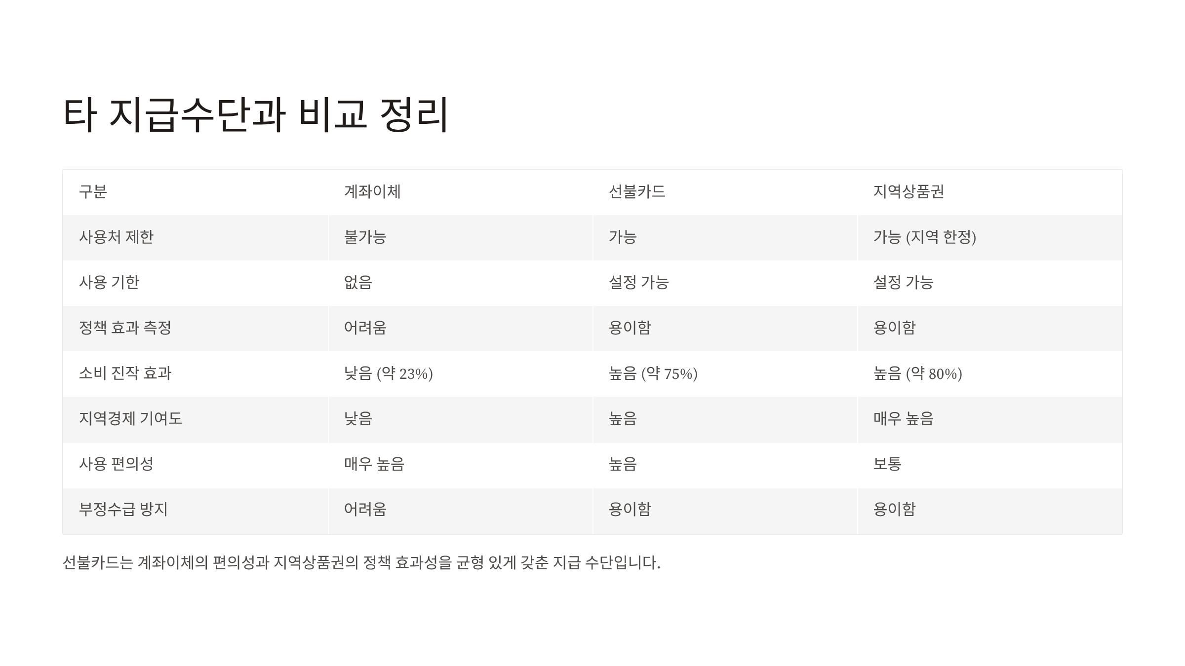 정책 설계자 입장에서는 “돈을 줄게, 대신 이 안에서 써줘”라는 메커니즘을 구현하는 가장 효과적인 방식이 바로 선불카드인 거예요. 💡