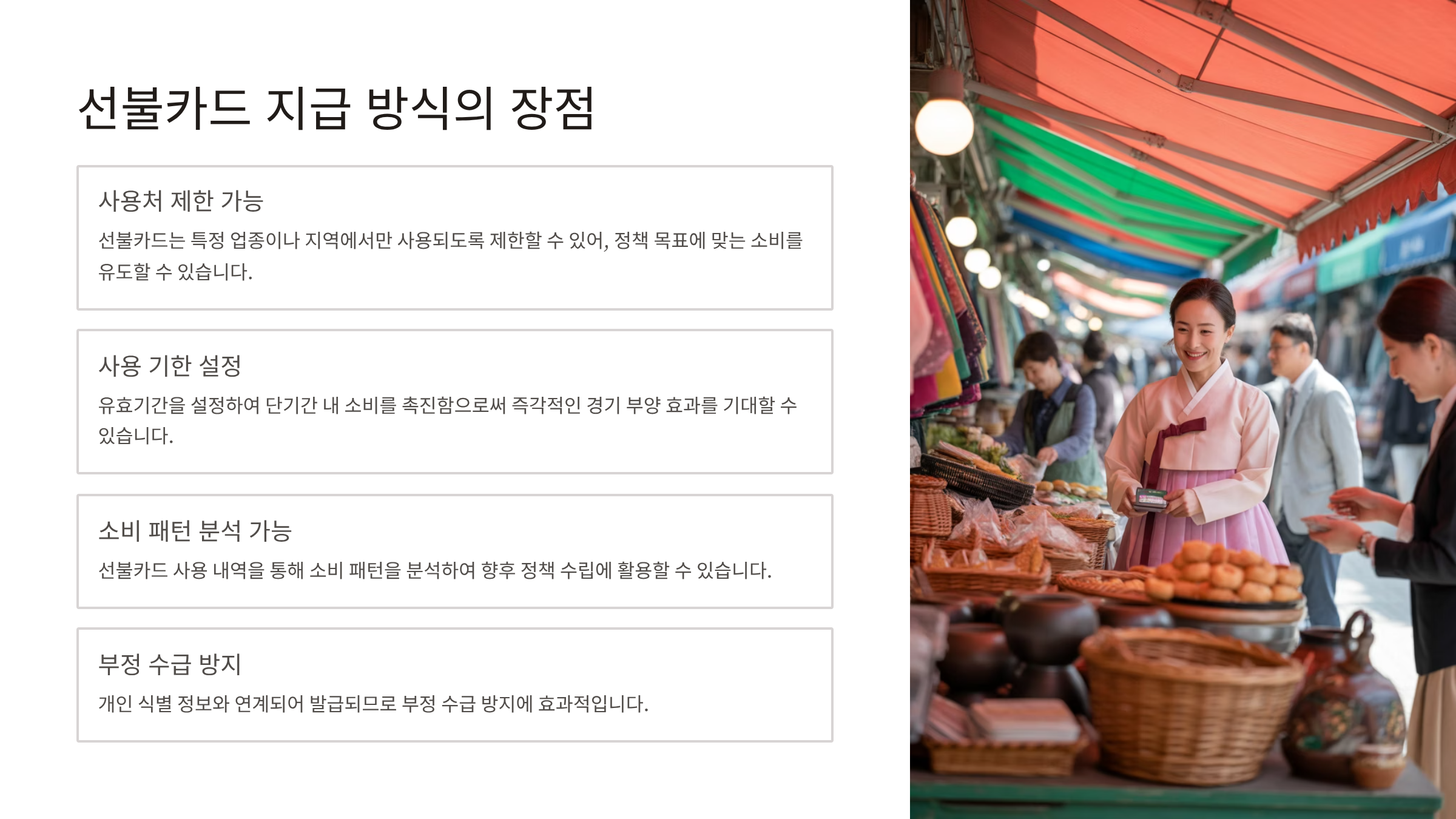 이렇게 정책 집행에서의 신뢰성과 투명성을 확보할 수 있다는 점이 선불카드 방식이 채택된 중요한 이유예요.