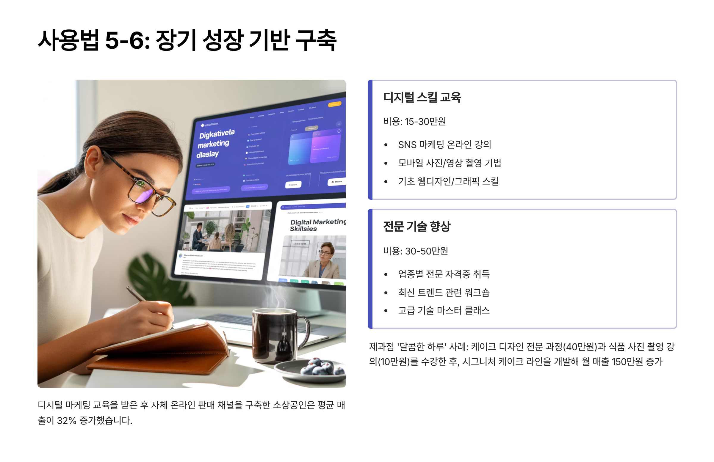 【사용법 5: 직원 교육 및 역량 강화】 10만원을 직원 교육에 투자하면 서비스 품질이 향상되고 고객 만족도가 높아집니다. 온라인 교육 플랫폼을 활용하면 저렴한 비용으로 전문 교육을 받을 수 있습니다.