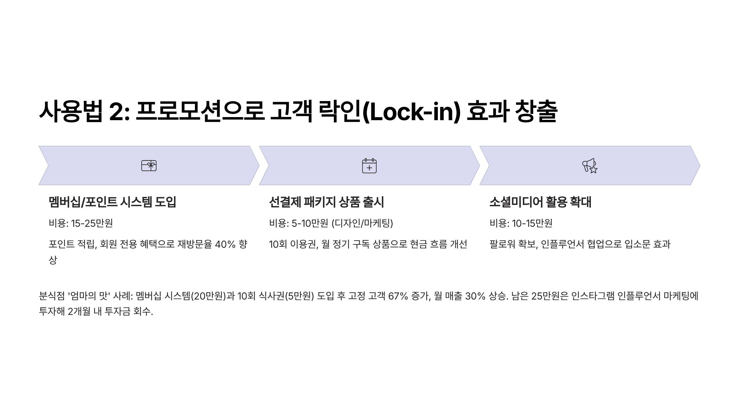 【사용법 7: 온오프라인 통합 전략】 남은 예산을 온라인과 오프라인을 연결하는 O2O 전략에 투자하세요. QR 주문 시스템, 온라인 예약, 배달/픽업 서비스를 통합하면 매출 채널이 다각화됩니다.