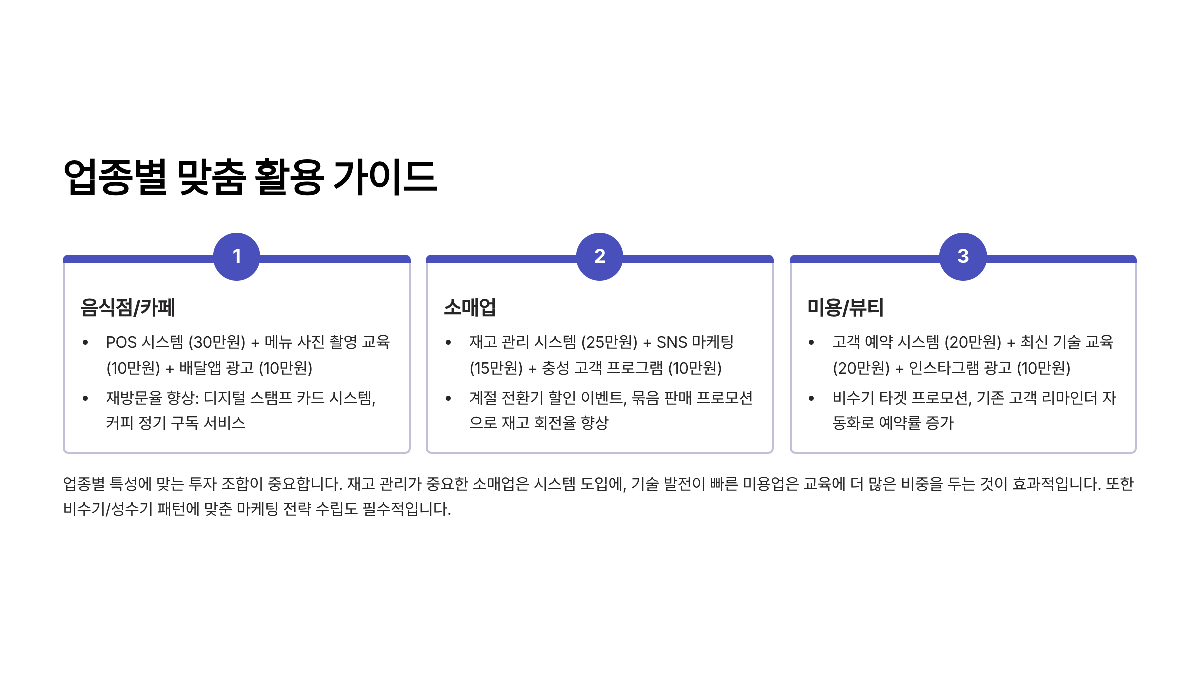 소매업: 재고관리 시스템 20만원, 온라인 쇼핑몰 구축 20만원, 포장재 개선 10만원으로 배분하세요. 특히 계절 상품이 많은 소매업은 재고 회전율 개선이 수익성의 핵심입니다.