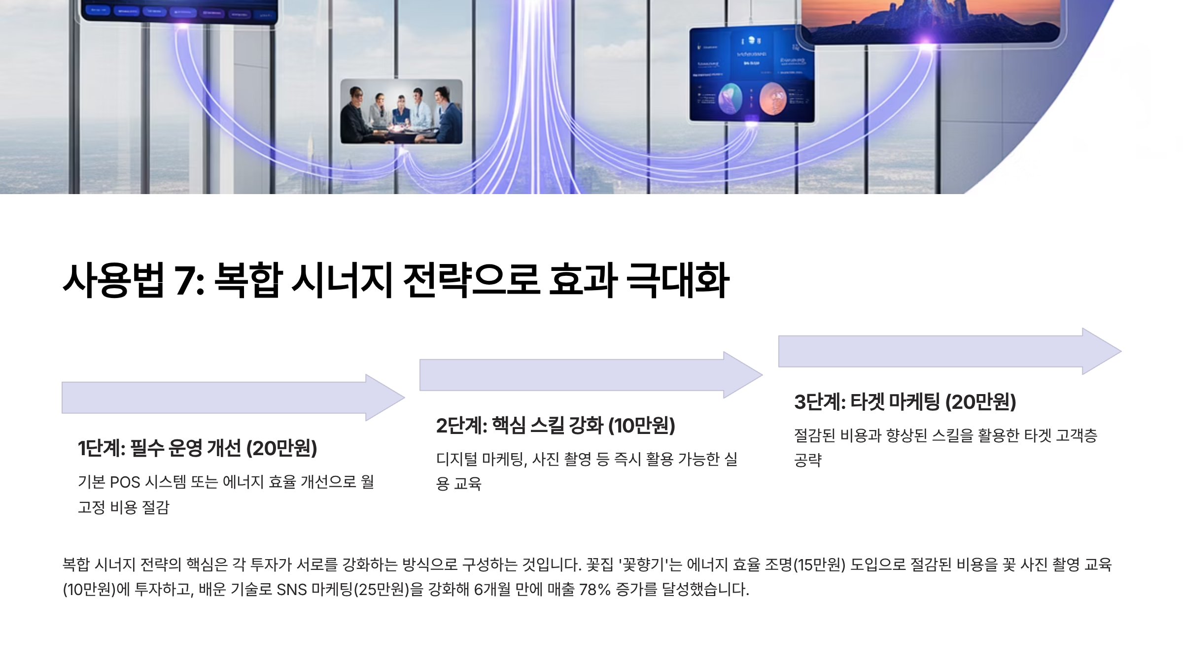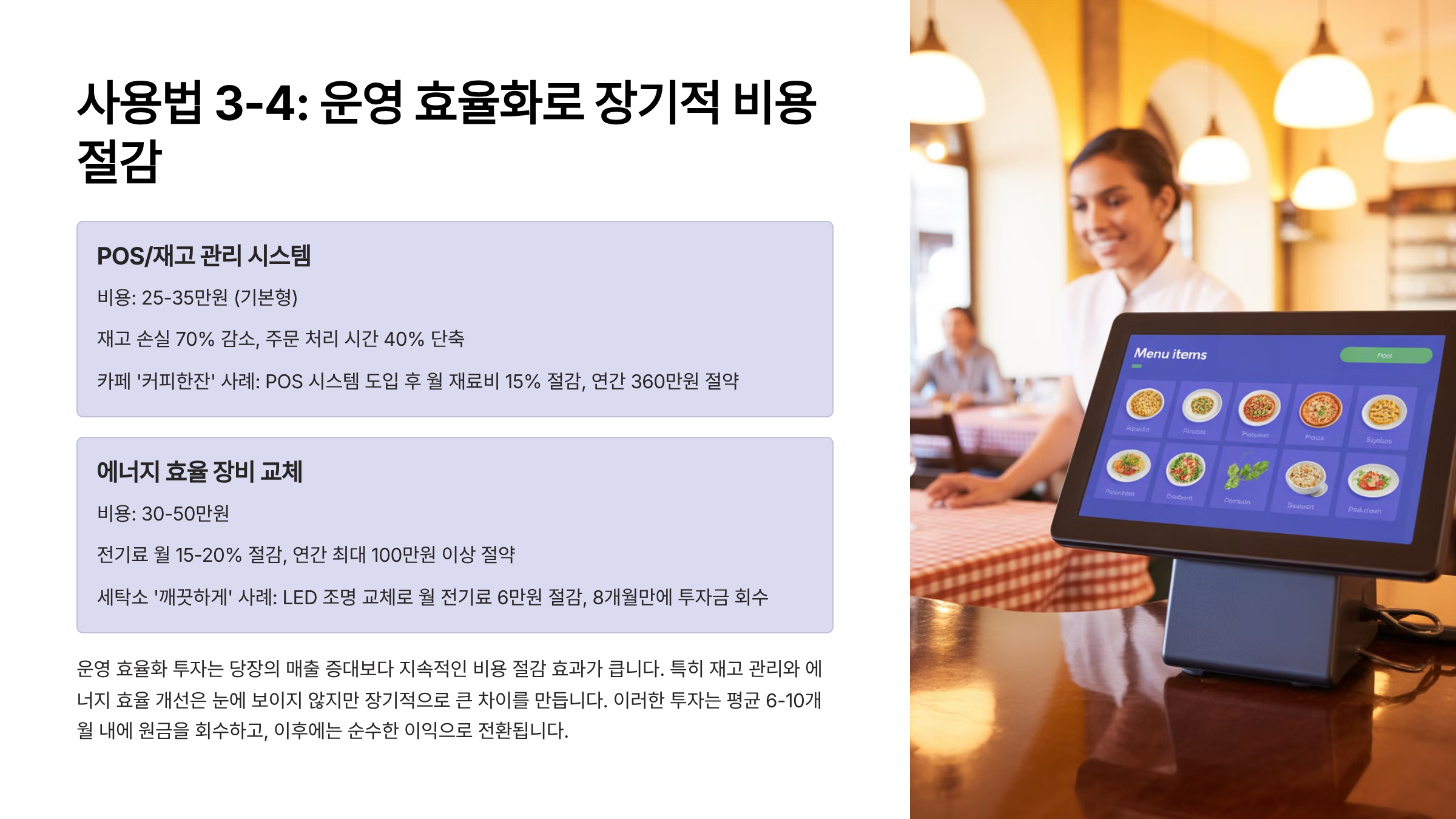 【사용법 3: 스마트 POS 시스템 도입】 20만원으로 클라우드 기반 POS를 도입하면 재고관리, 매출분석, 고객관리가 자동화됩니다. 월 30시간의 업무시간을 절약할 수 있으며, 이는 인건비 50만원에 해당합니다.