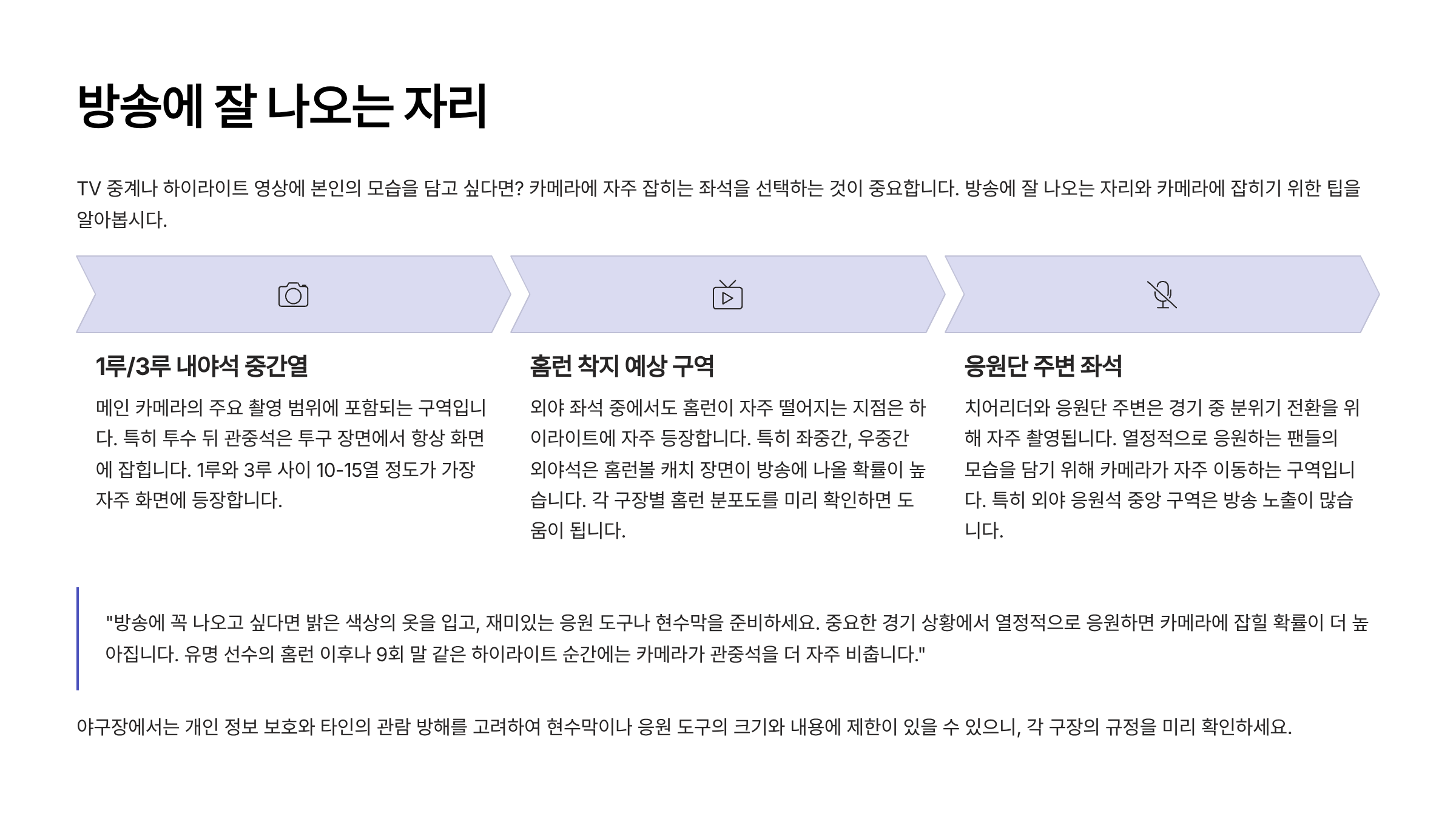 반대로 **3-4층 높은 좌석**이나 **사각지대**는 방송에 나올 확률이 낮습니다. 방송 출연이 목적이라면 이런 자리는 피하는 것이 좋아요.