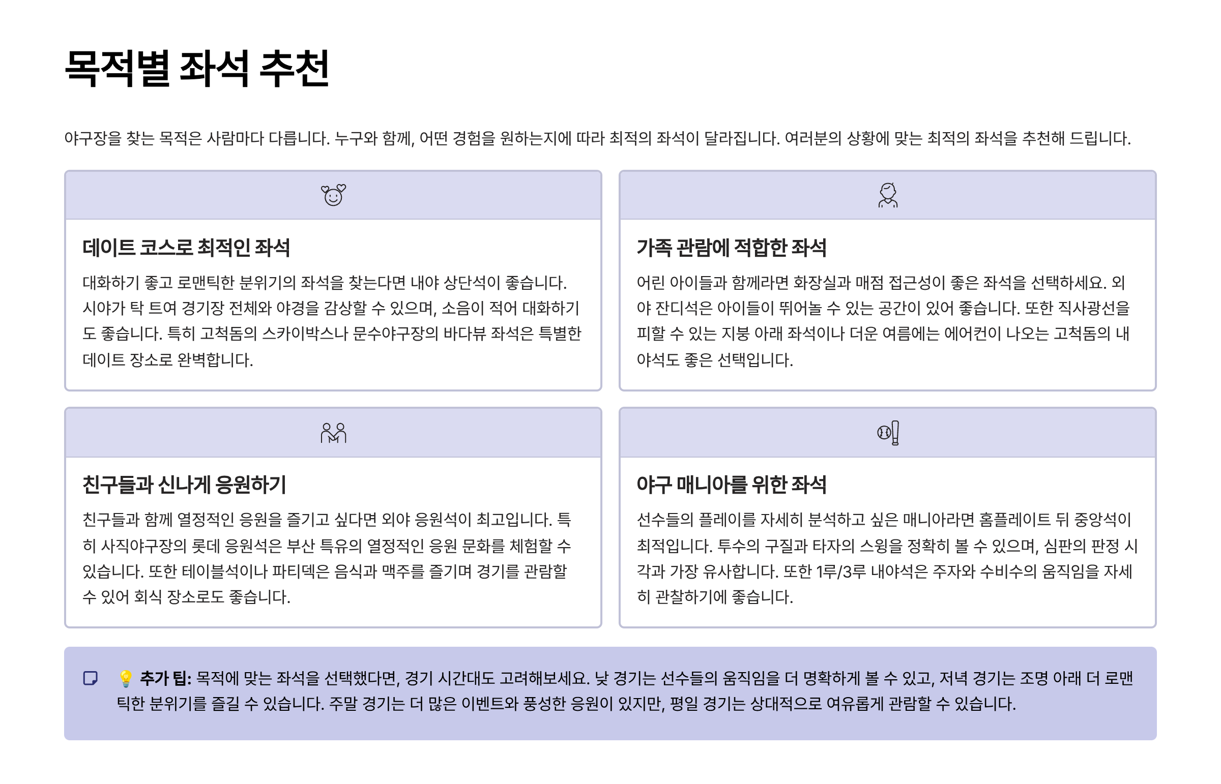 불꽃야구 직관의 목적에 따라 최적의 좌석이 달라집니다. 혼자 조용히 보고 싶은지, 가족과 함께 편하게 보고 싶은지, 아니면 열정적으로 응원하고 싶은지에 따라 선택해야 할 자리가 완전히 다르죠.