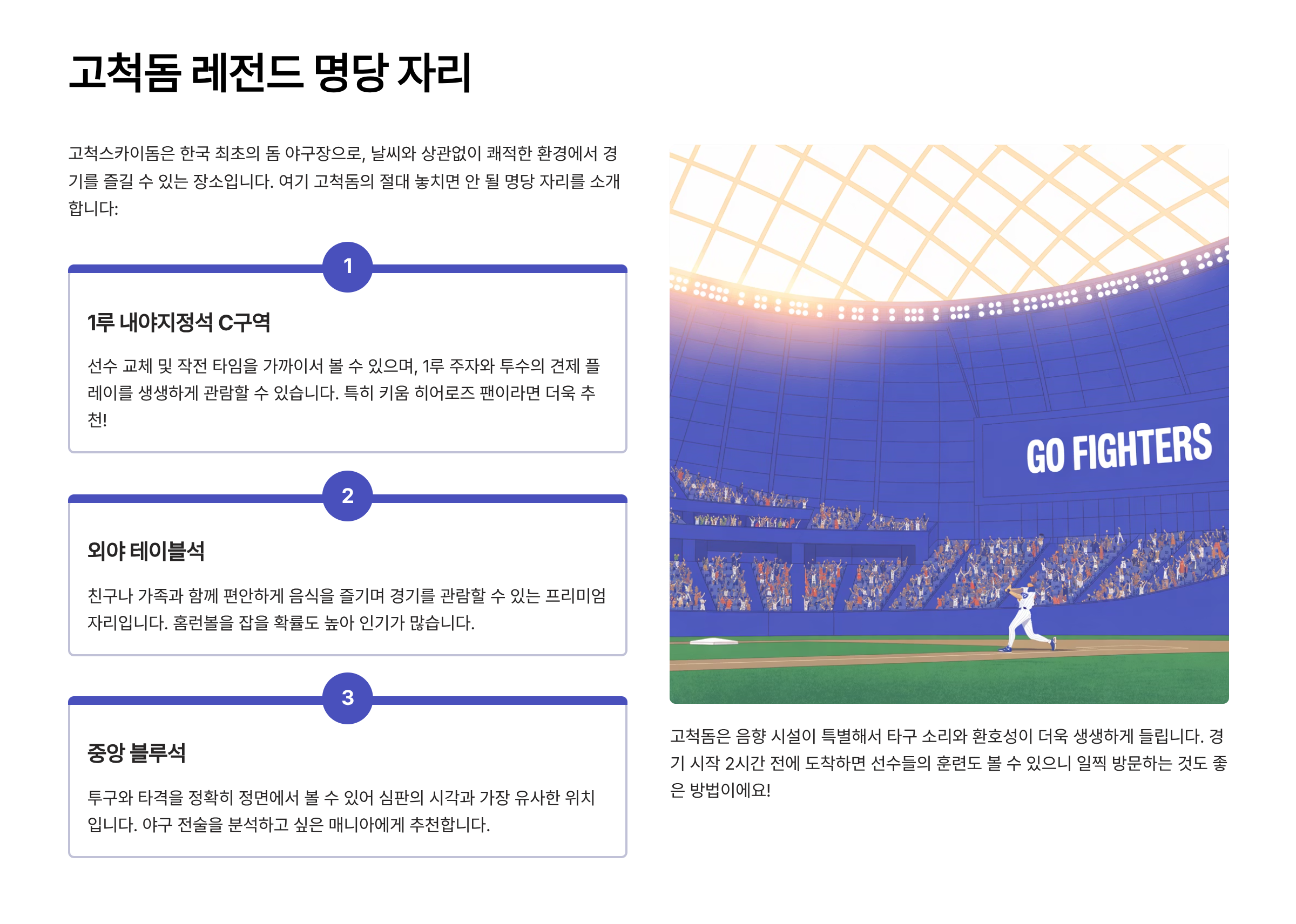 **시야가림석**은 가장 피해야 할 자리입니다. 특히 기둥이나 구조물 때문에 투수나 타석이 보이지 않는 자리는 정말 답답해요. 고척돔의 경우 1-3번 좌석은 기둥 때문에 시야가 가려지니 피하세요.