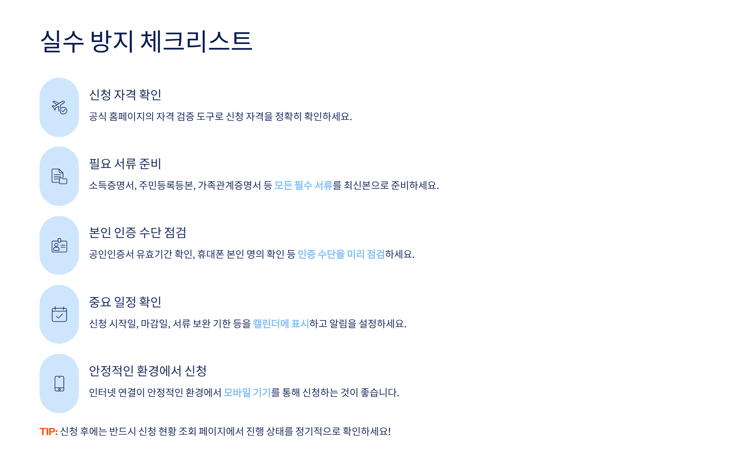 신청 전 반드시 확인해야 할 체크리스트를 준비했습니다. 이 리스트를 하나씩 확인하면서 신청하면 실수를 크게 줄일 수 있습니다.