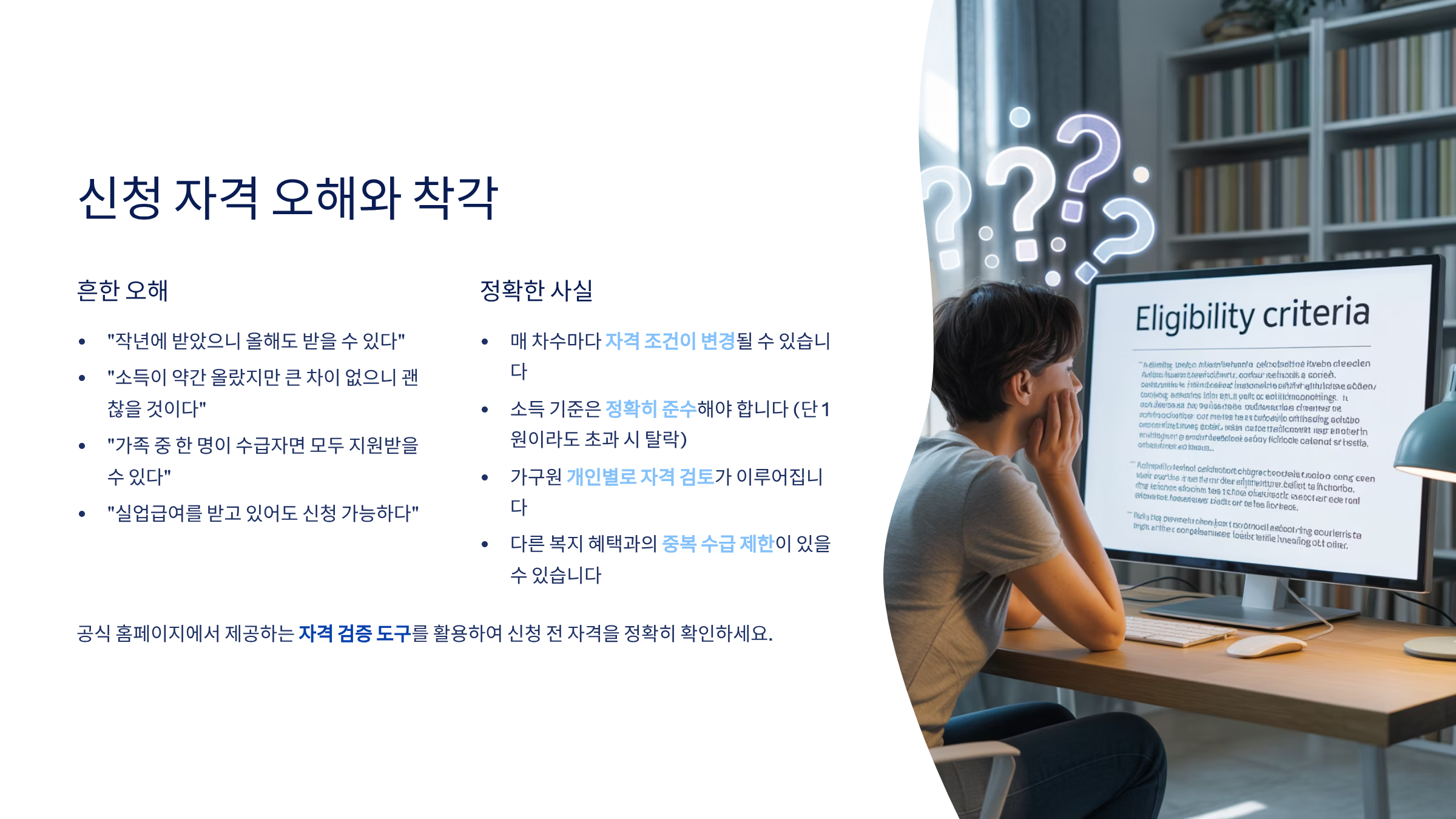 외국인 관련 오해도 많습니다. 결혼이민자, 영주권자는 신청 가능하지만, 단기 체류자는 불가능합니다. 국적이 아닌 체류 자격이 중요한 기준입니다.