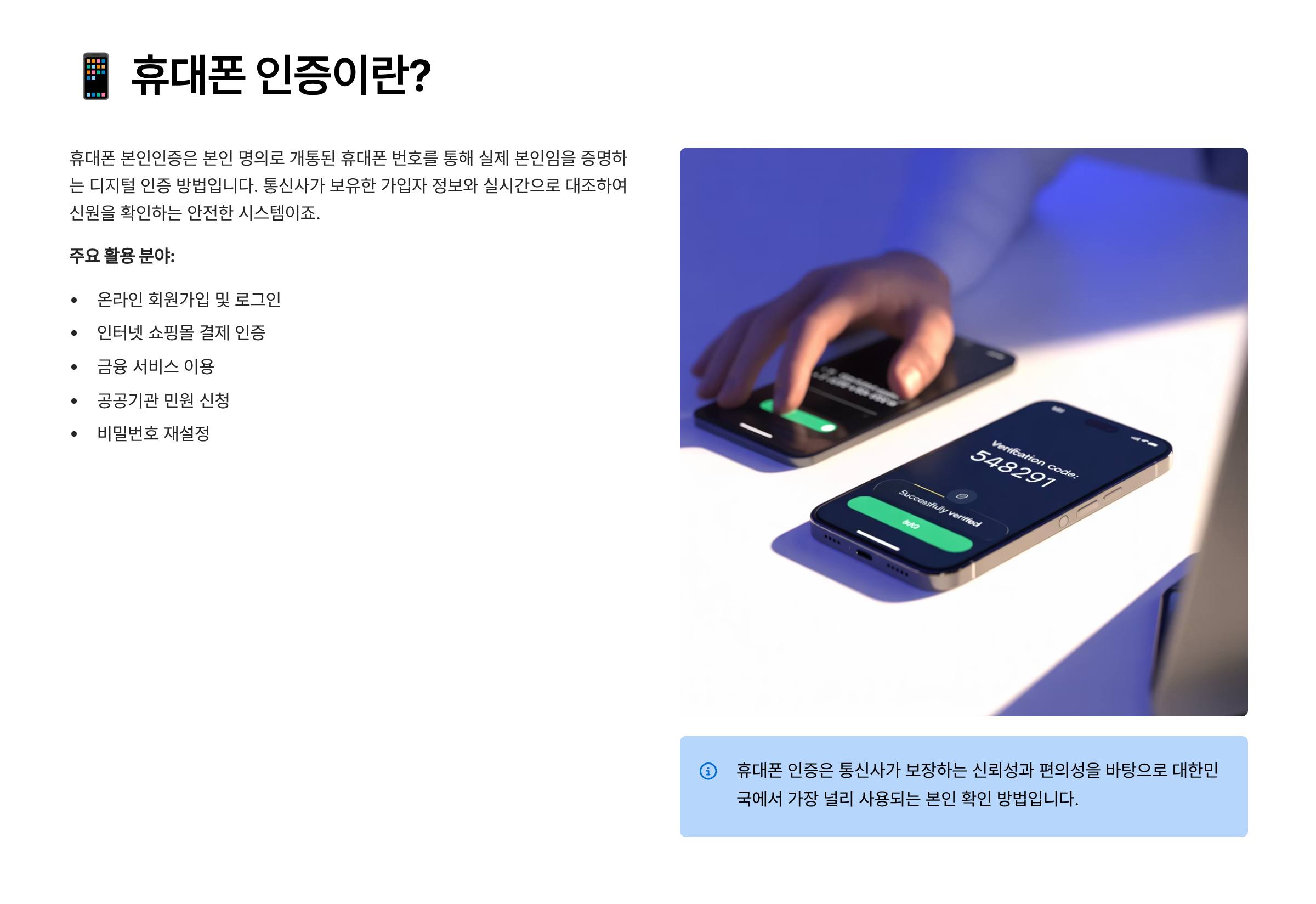 통신사가 사용자의 명의, 단말기 상태, 회선 정보를 종합해 실시간으로 본인 여부를 인증해줘요. 단순한 문자 인증이 아니라 통신망을 기반으로 한 신뢰 높은 인증 방식이에요.
