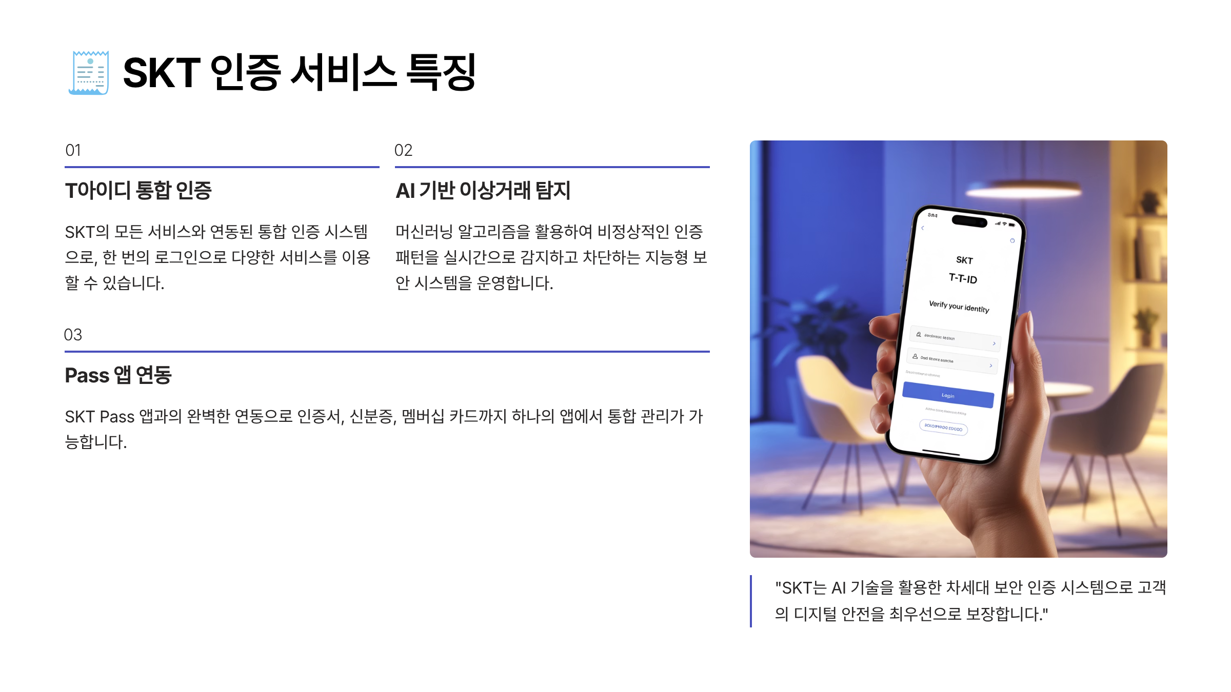 SKT는 T월드 기반의 본인 인증 시스템을 갖추고 있으며, ‘이상 인증 패턴 분석’ 시스템이 탑재되어 있어요. 사용자의 인증 패턴을 학습해서 비정상 시도를 자동으로 탐지해줘요.