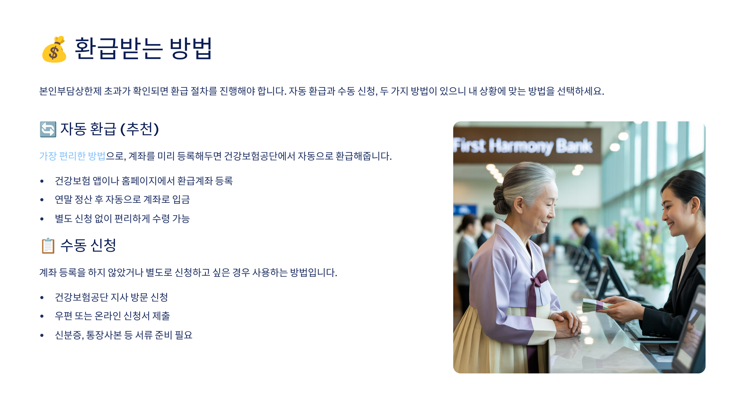 가장 빠른 방법은 ‘공단 홈페이지 로그인 → 본인부담상한제 → 초과내역 조회 → 환급 계좌 입력’이에요!