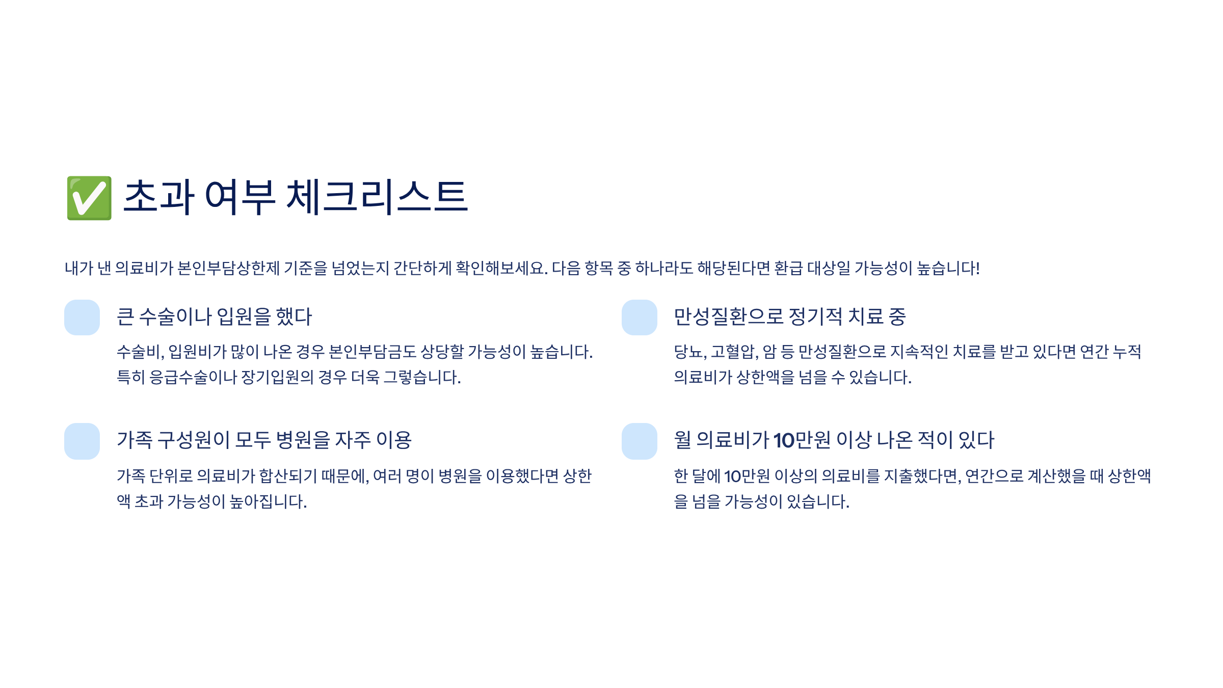 위 조건 중 2개 이상 해당된다면, 본인부담상한제 환급 대상일 가능성이 아주 높아요. 👀