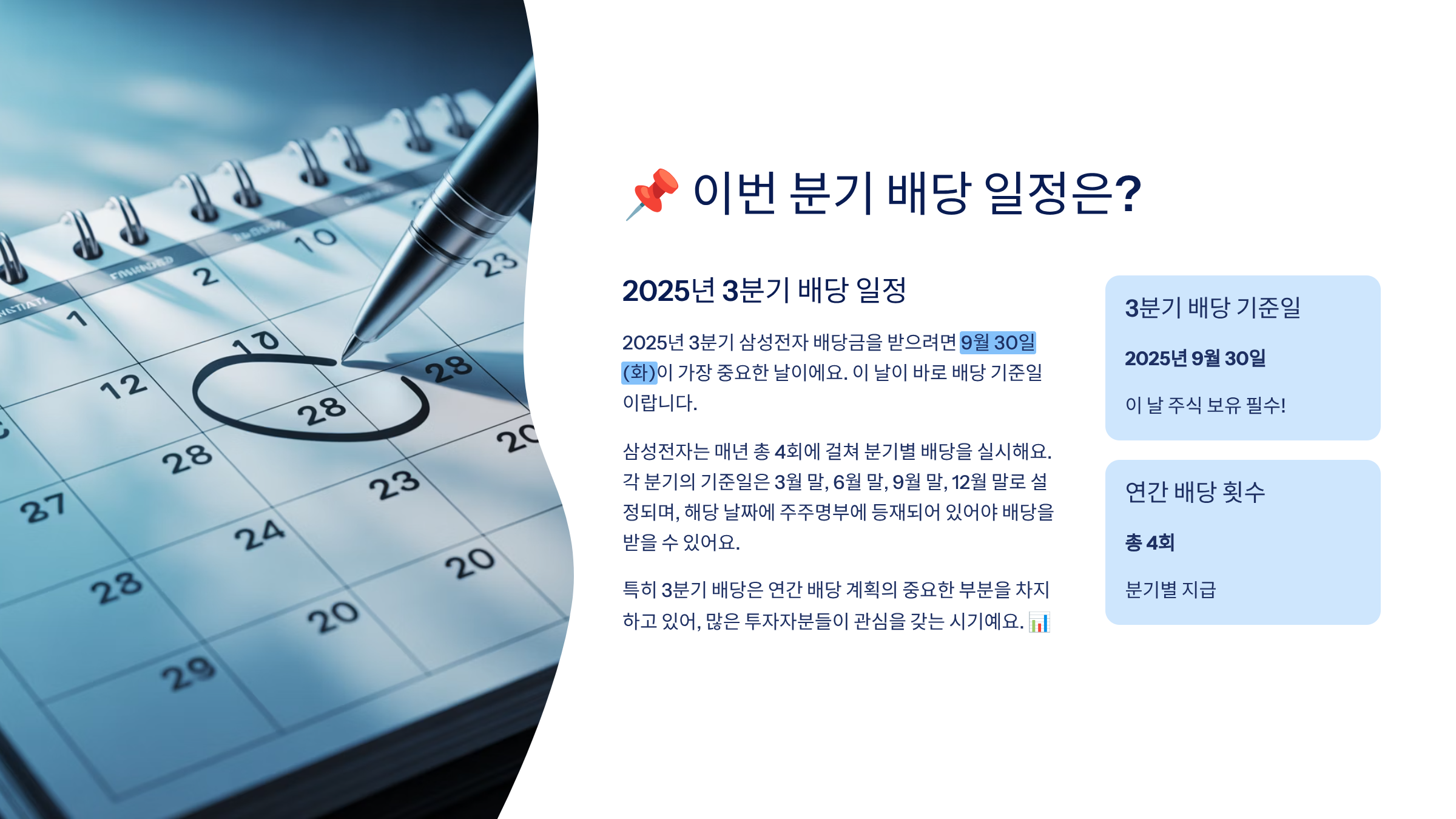 삼성전자는 연 4회 분기 배당을 진행하는데, 각각의 기준일은 3월, 6월, 9월, 12월 말에 잡혀요. 이번 분기는 9월 마지막 영업일인 30일이 해당되죠. 📍