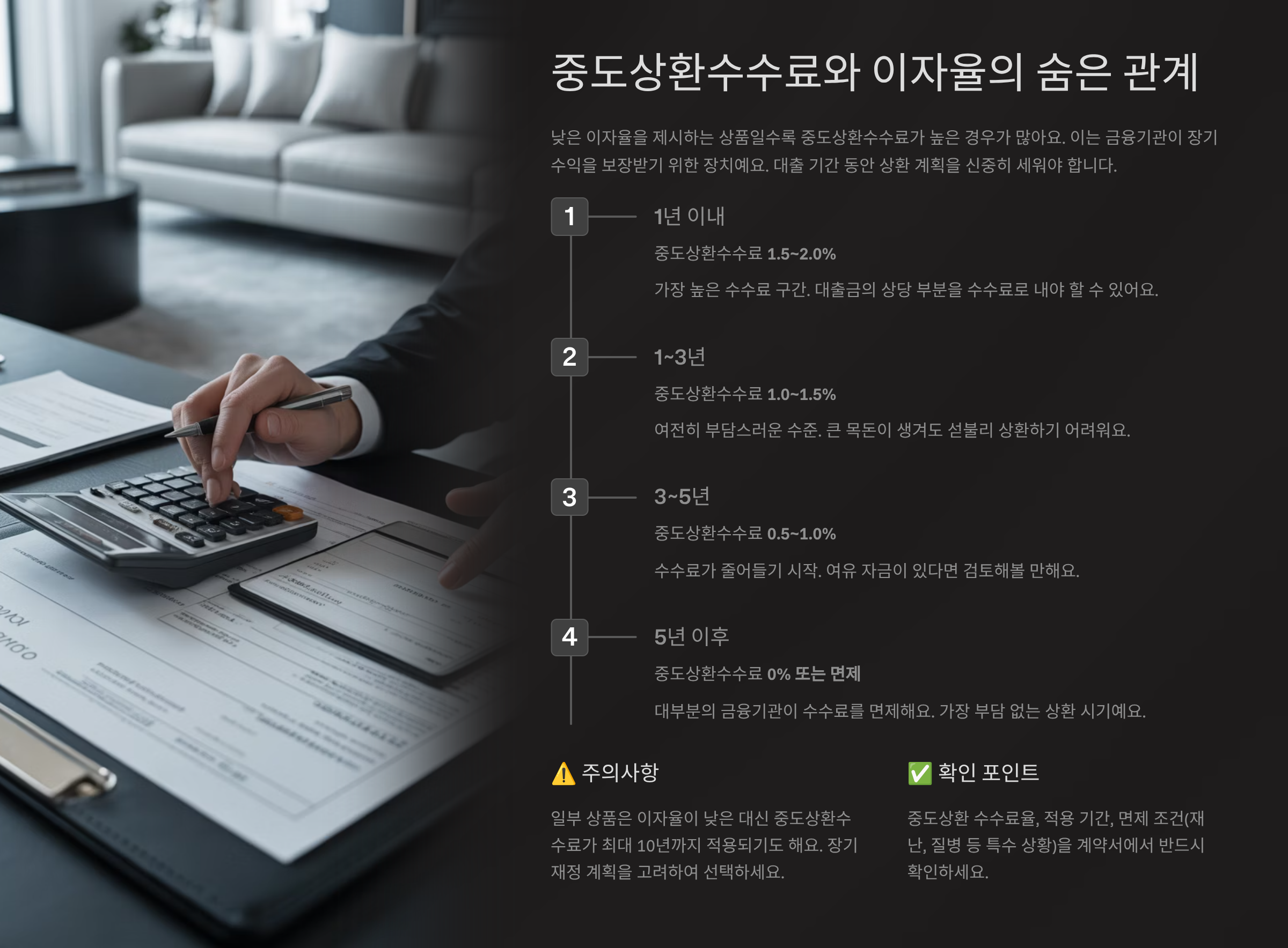 문제는 일부 대출 상품이 ‘초기 금리는 낮게’, ‘중도상환수수료는 길게’ 설정돼 있다는 거예요. 이럴 경우 1~2년 안에 갈아타거나 상환하려면 오히려 손해를 볼 수도 있어요.