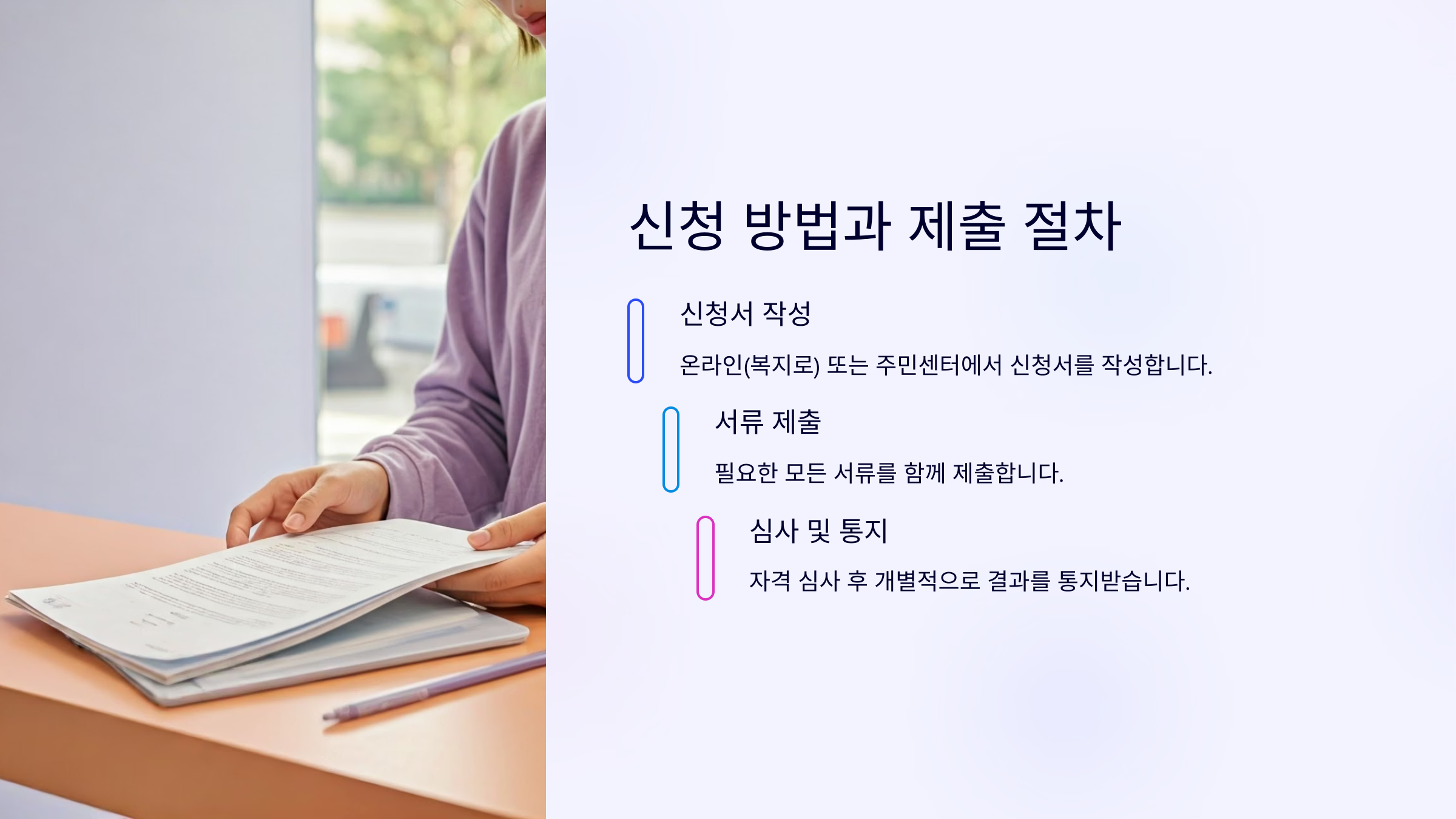 서류 준비에 어려움이 있다면 주민센터 직원에게 도움을 요청하거나, 복지로 고객센터에 문의하면 상세하게 안내받을 수 있어요.