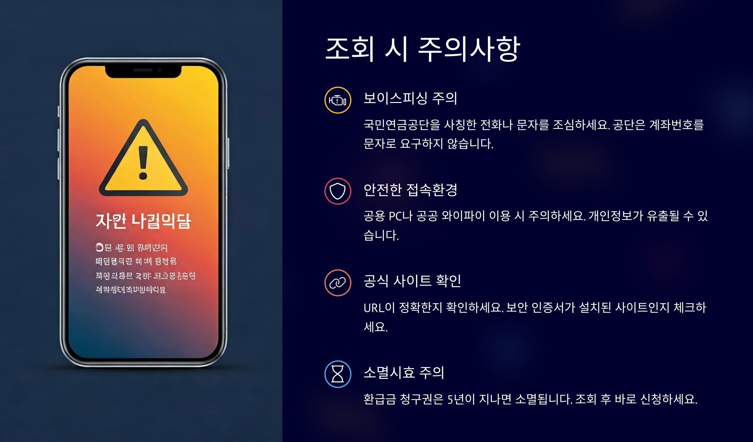 국민연금 환급금은 소중한 내 돈이기 때문에, 조회하고 수령할 때 몇 가지 꼭 주의할 점이 있어요.