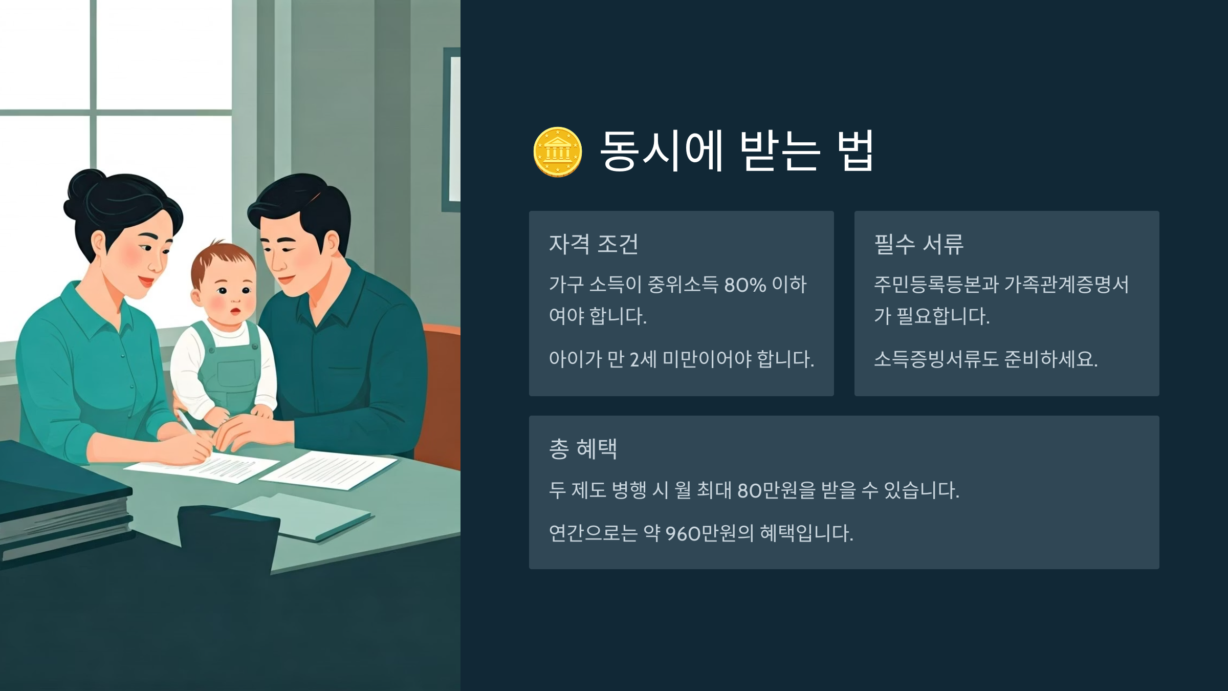 동시에 받기 위한 가장 중요한 조건은 ‘출생신고 후 주민등록 완료된 상태’예요.
