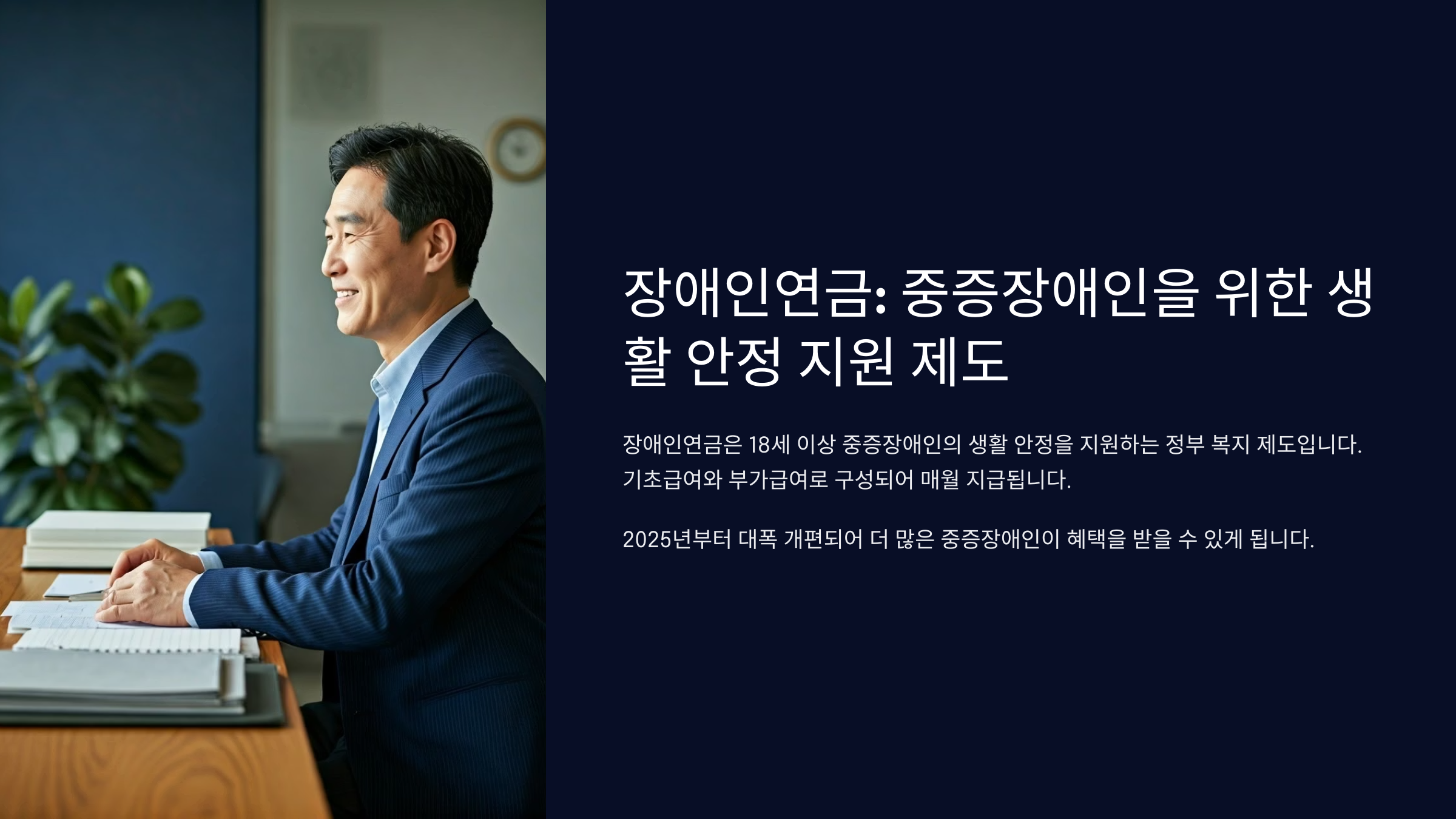 | 수급 요건 | 연령, 중증장애, 소득·재산 기준 |