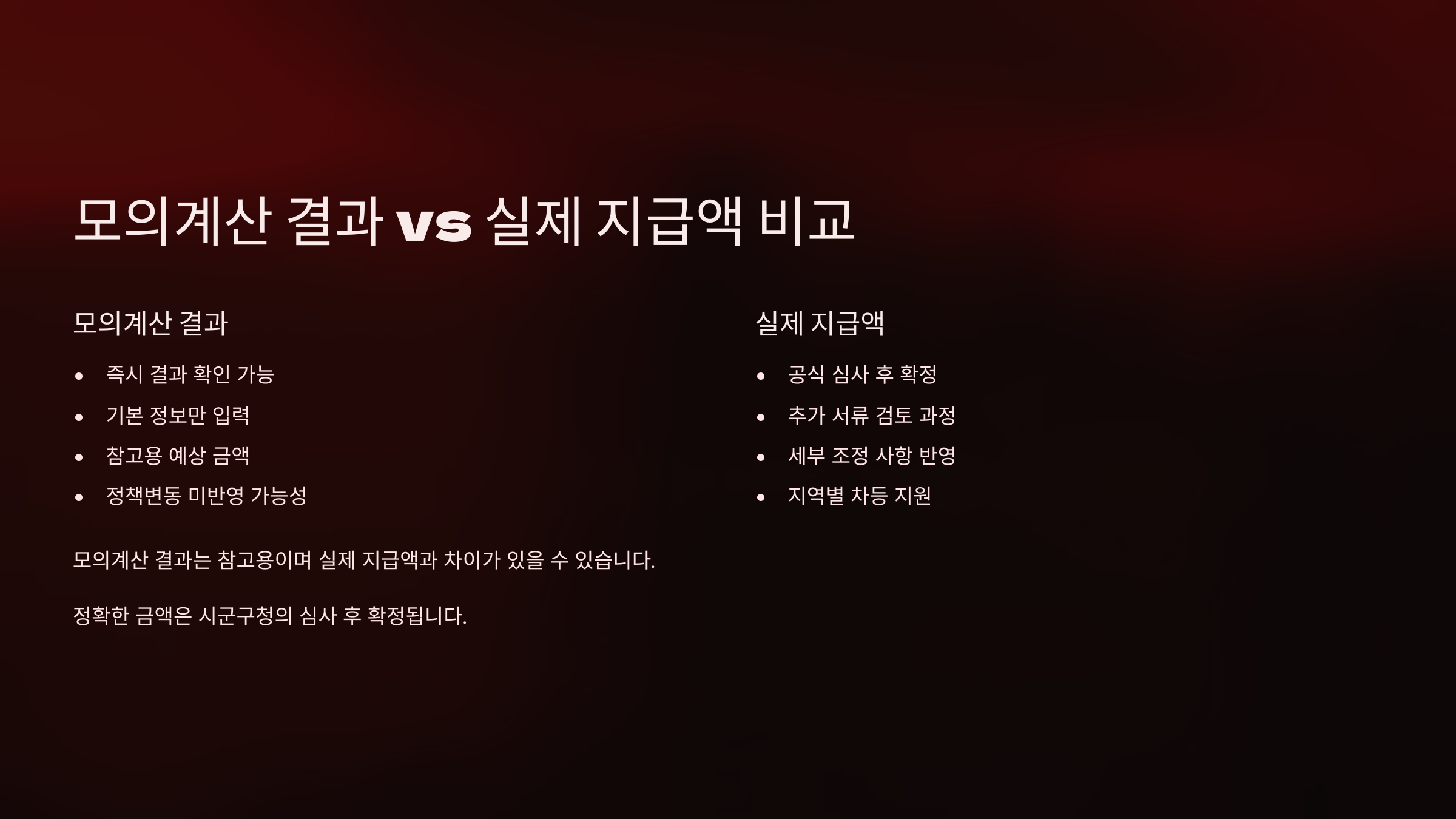이유는 모의계산기는 단순 입력값 기반이고, 실제 지급은 서류 확인, 현장 조사, 지자체 재량 등이 반영되기 때문이에요.