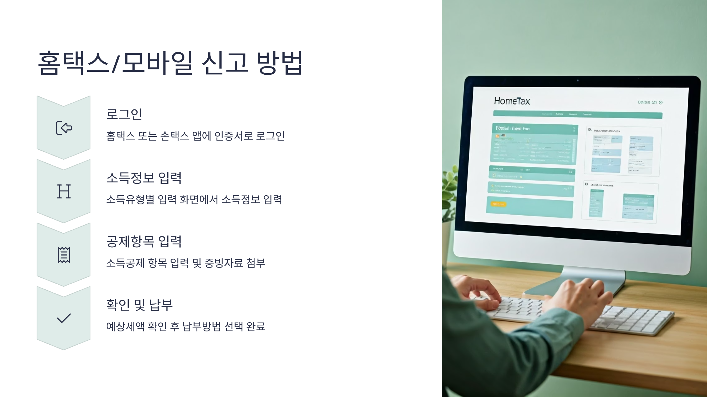 홈택스를 통해 간편하게 전자신고할 수 있으며, 정확하게 신고하면 환급도 받을 수 있어요.