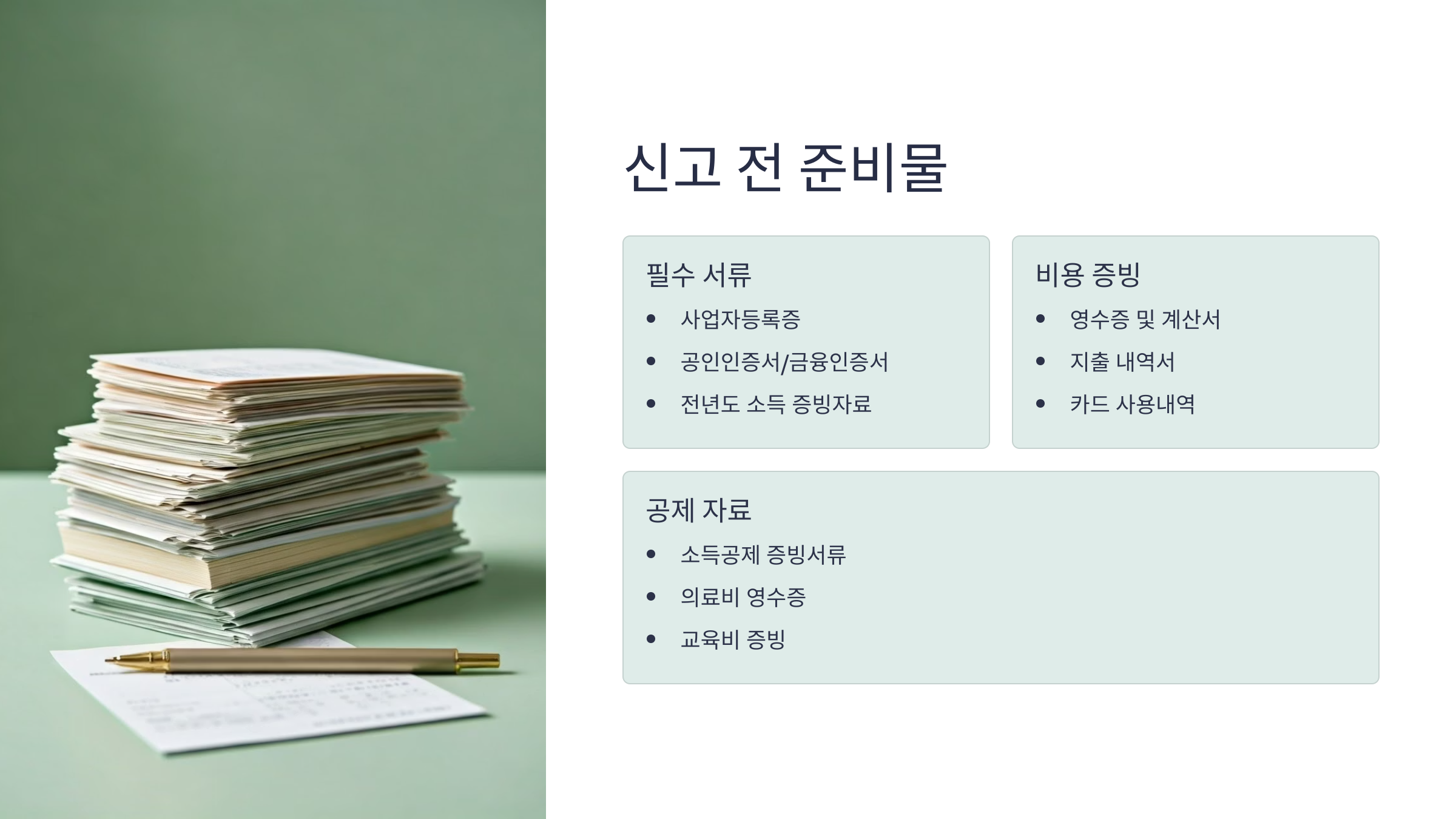 이 서류들은 홈택스에서도 일부 자동 조회가 가능하지만, 미리 확인해두면 신고가 빨라져요!